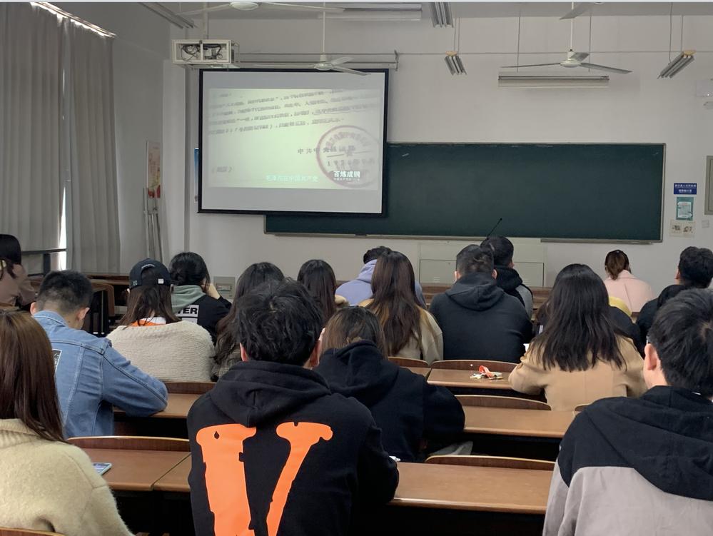 4月15日晚,在北校区知行楼教室,人文学院各团支部集中观看《百炼成钢:中国共产党的100年》纪录片,2020级辅导员与学生一起观看学习。